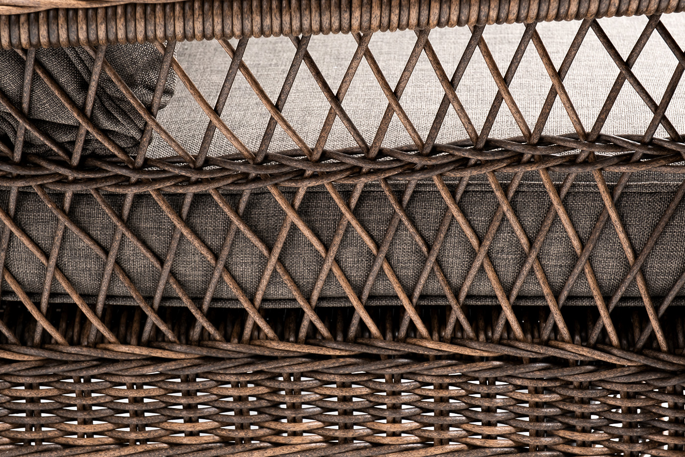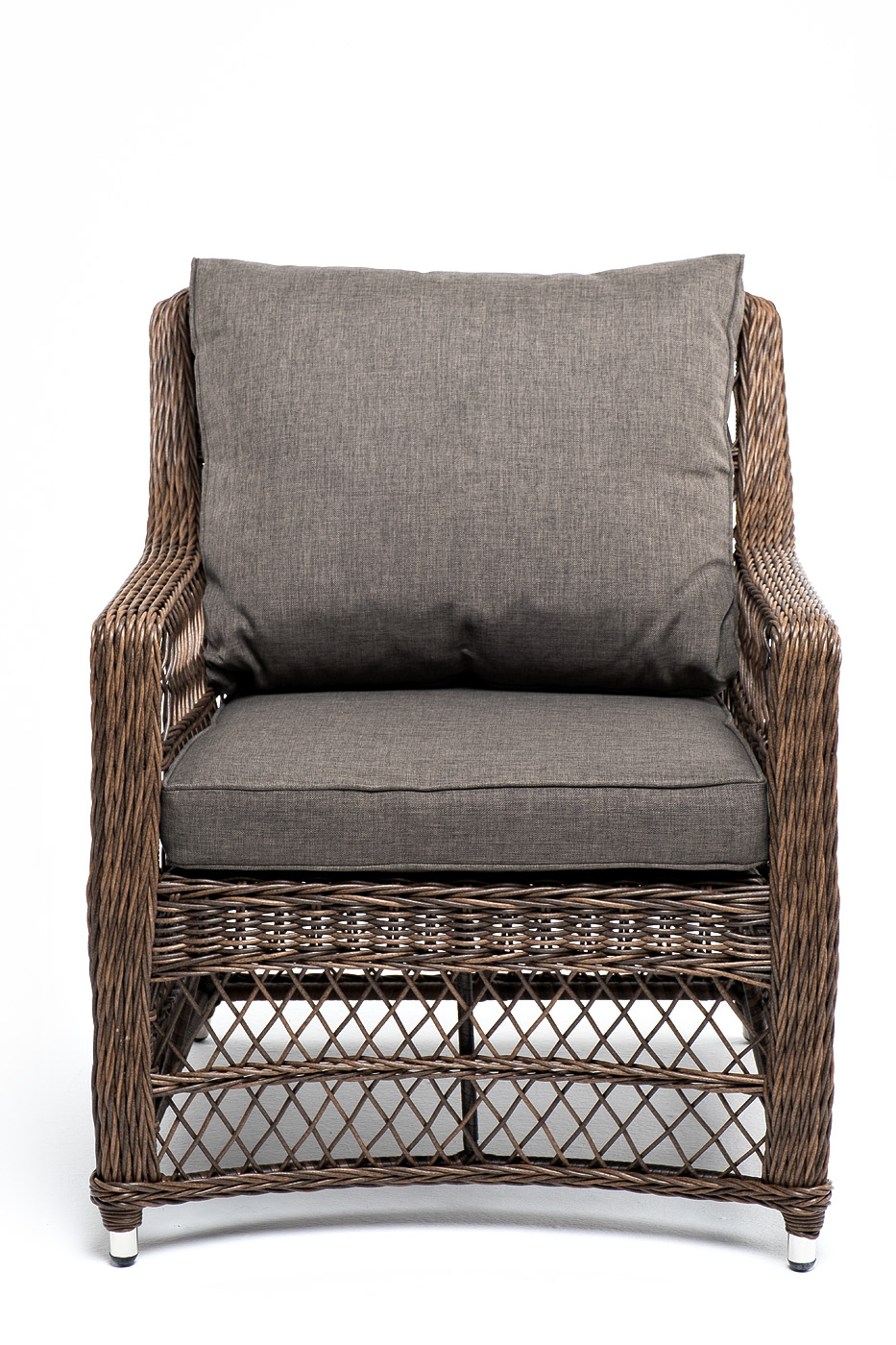 Укомплектовано плетеное кресло удобными мягкими подушками, одна из которых располагается в области спинки. Они выполнены в серо-коричневом оттенке. При пошиве тканевых изделий используется полиэстер, плотностью 230гр/м2. Он в обязательном порядке проходит обработку влагоотталкивающей пропиткой.