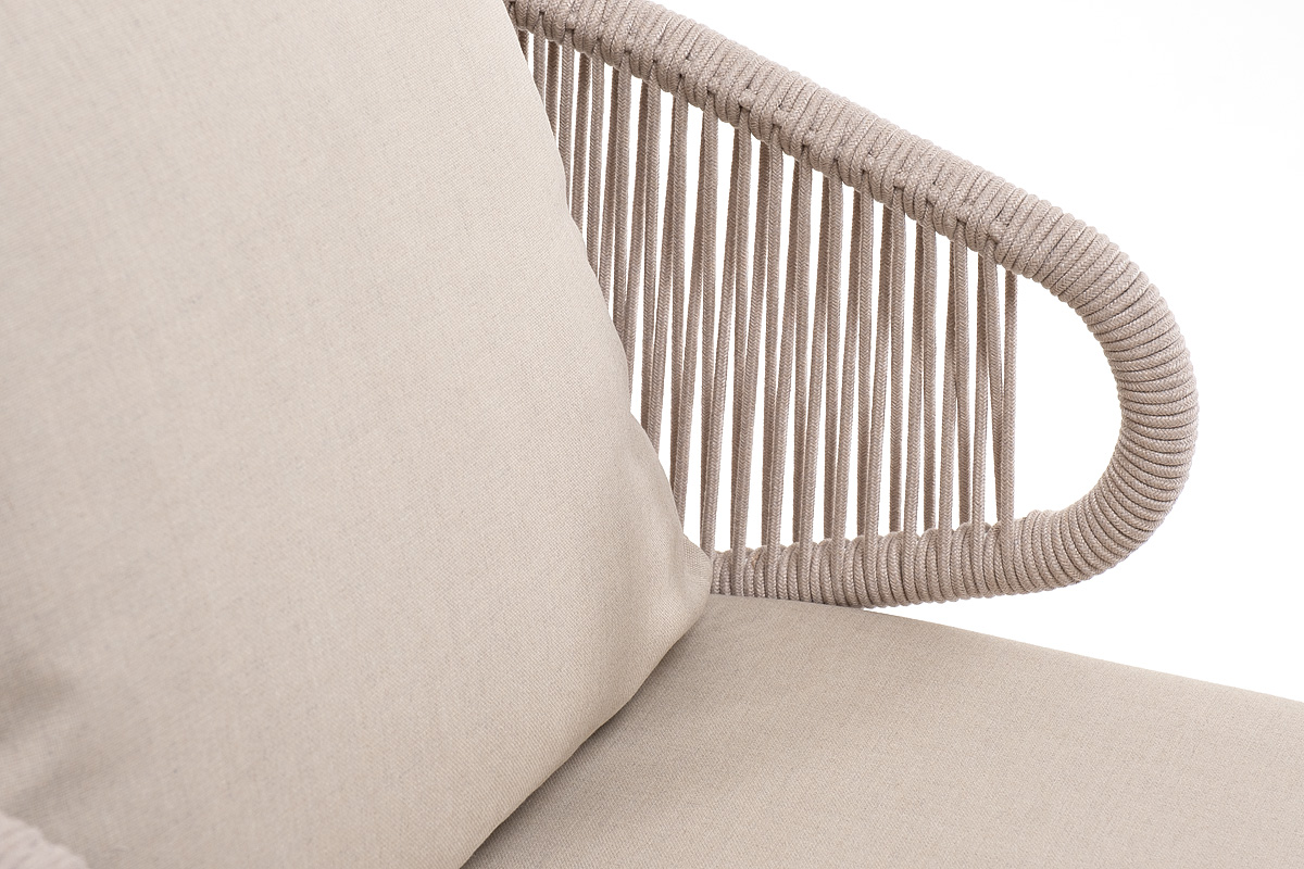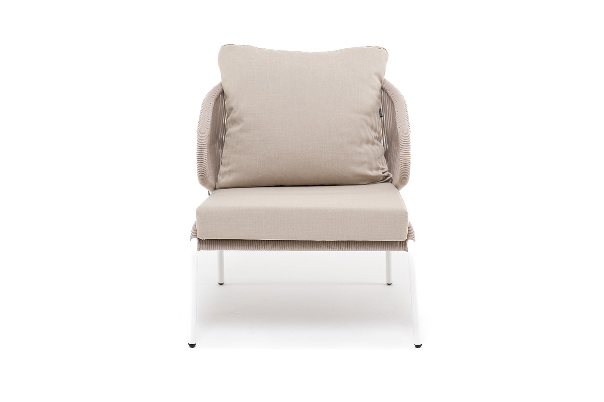 "Милан" кресло плетеное из роупа, каркас алюминий белый муар, роуп бежевый круглый, ткань бежевая 035