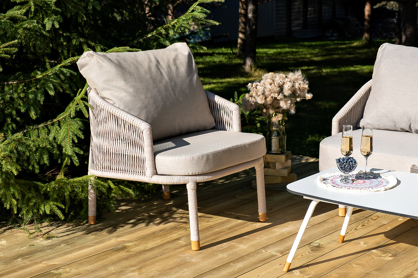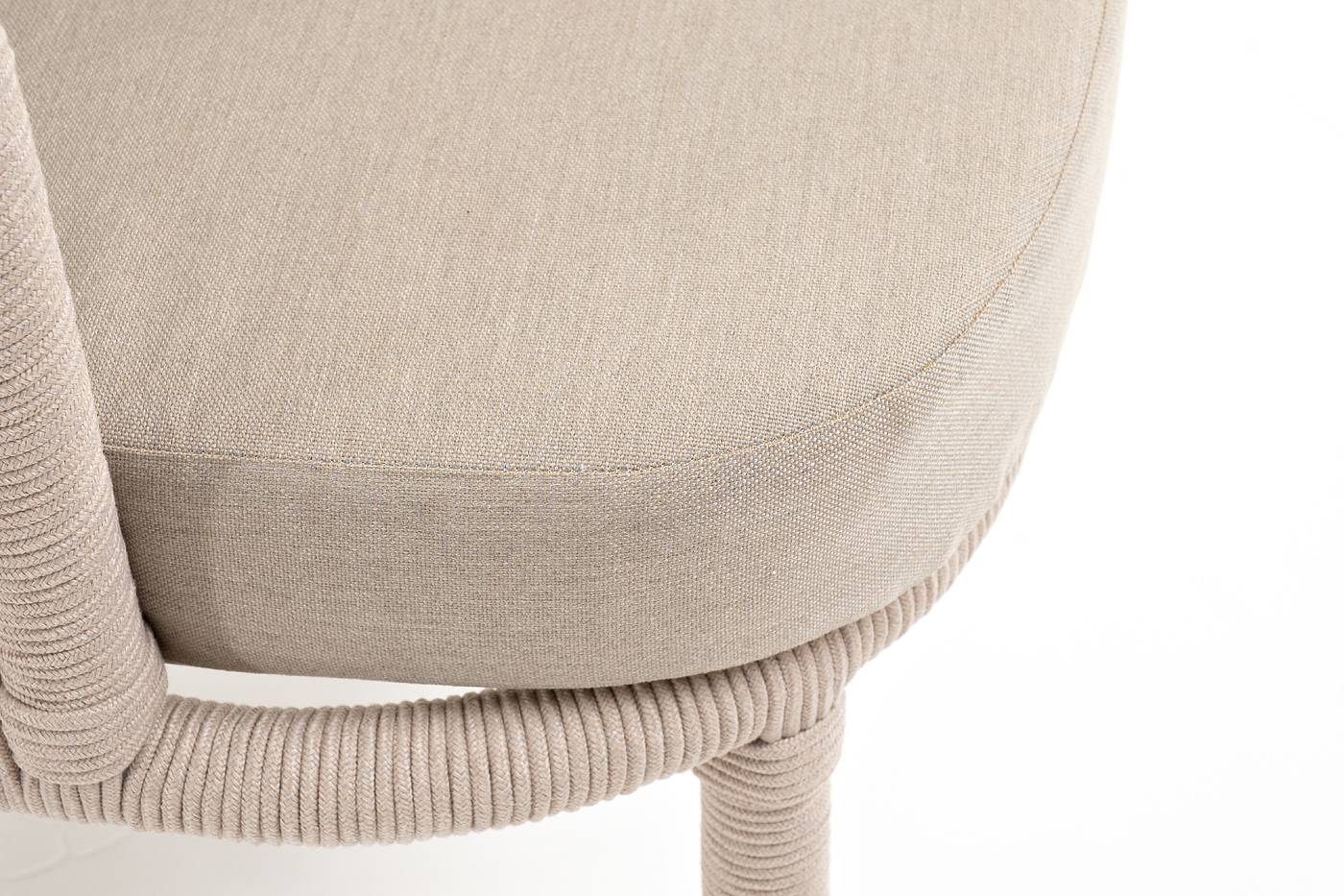 Кресло имеет алюминиевый каркас, окрашенный порошковой краской в белый цвет. Боковины каркаса вручную оплетены роупом - эластичными синтетическими лентами, изготовленными из высокопрочных полиэфирных волокон. Цвет оплетки - бежевый. На ножках кресла идут дубовые наконечники (заглушки).