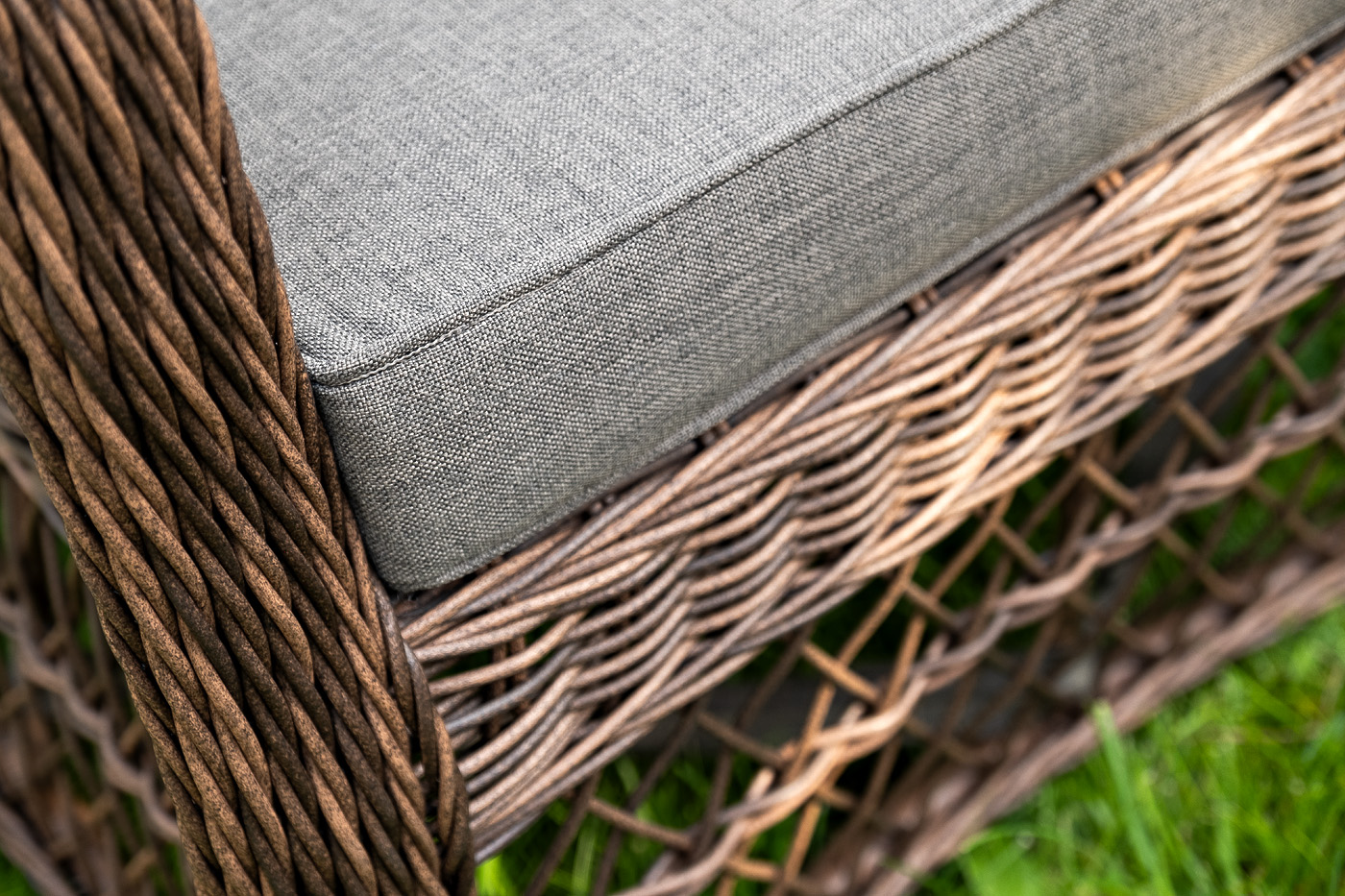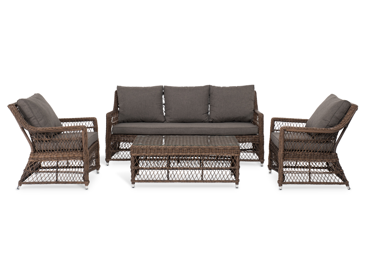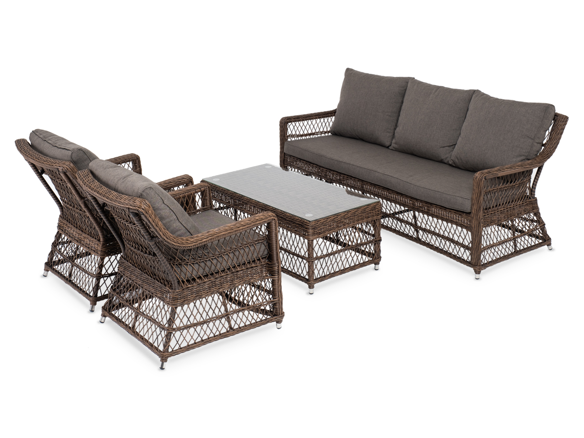 Уличная мебель имеет алюминиевый каркас, ручное плетение, сделанное из коричневого искусственного ротанга. Предусмотрены мягкие подушки из полиэстера серо-коричневого цвета с плотностью 230гр/м2. Они имеет влагоотталкивающую пропитку. Рабочая поверхность столика изготовлена из закаленного стекла толщиной 5 мм.
